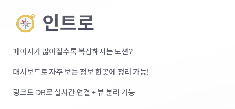 대시보드는 자주 확인할 정보를 한 곳에 모은 노션의 홈 화면이라고 생각하면 돼요.