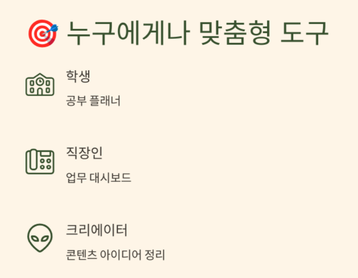 처음에는 메모앱처럼 가볍게 시작할 수 있지만, 익숙해지면 데이터베이스나 협업 시스템까지도 만들 수 있는 확장성을 지녔어요.
