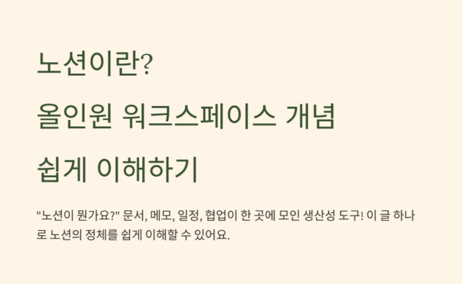 노션(Notion)은 문서 작성, 데이터 정리, 일정 관리, 협업 도구가 모두 결합된 ‘올인원 워크스페이스’입니다.