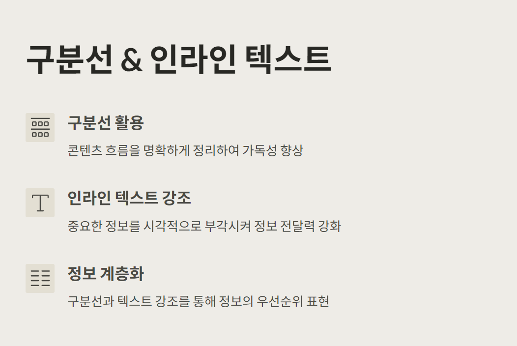 노션은 블록 기반 도구지만, 글을 구조화하기 위해 구분선(Divider)과 인라인 텍스트도 적극 활용해야 해요.