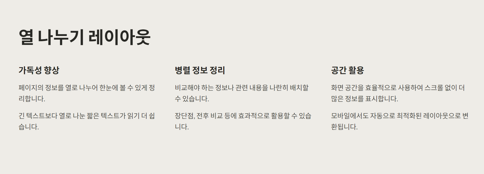 열 나누기를 활용하면 두 개 이상의 정보를 한눈에 비교하거나 분산해 배치할 수 있어요.