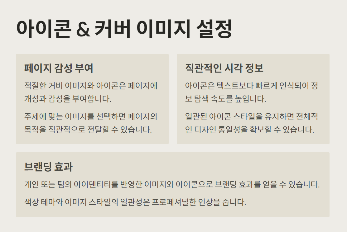 아이콘과 커버 이미지가 있으면 페이지가 훨씬 ‘내 것’ 같고, 들어갈 때마다 기분 좋아져요!