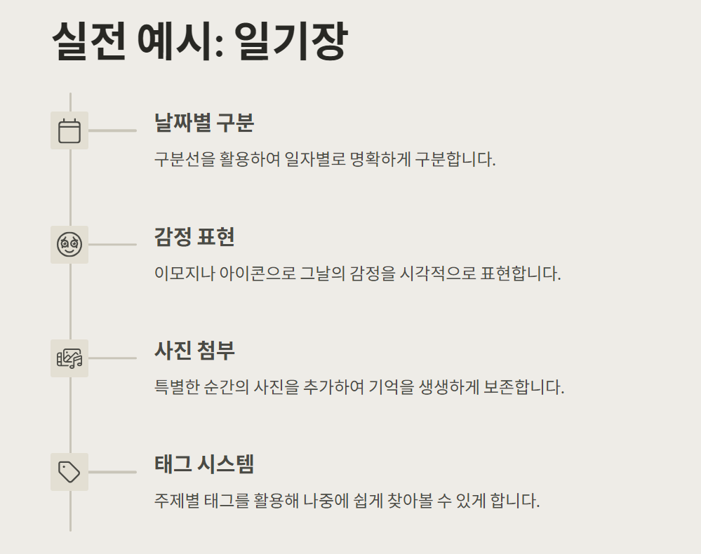 - 예: 📔 일기, 🗓️ 플래너, ✅ 체크리스트