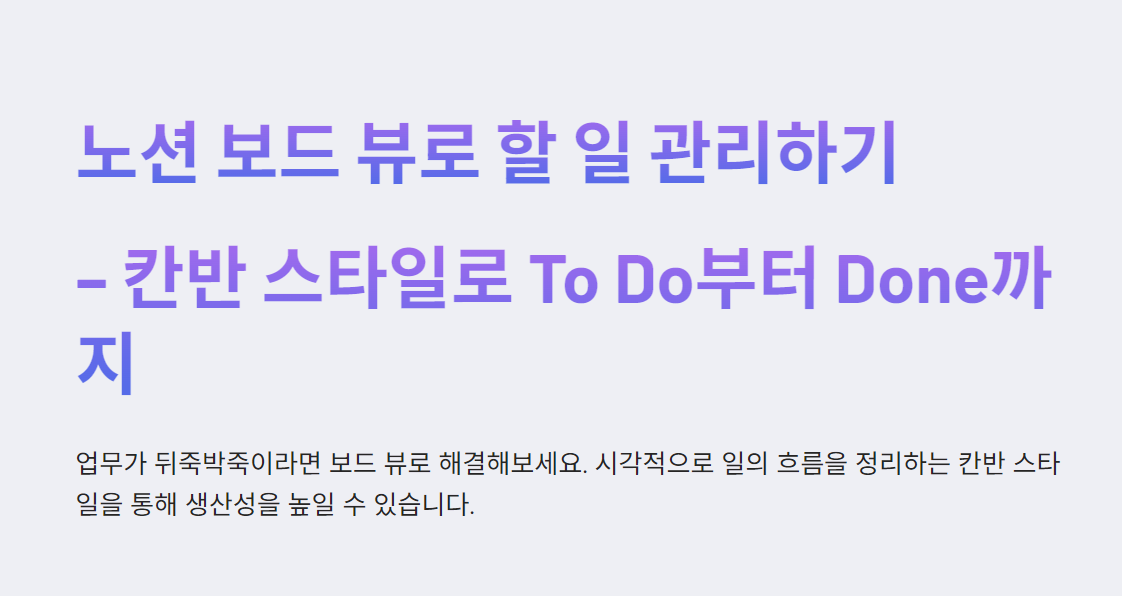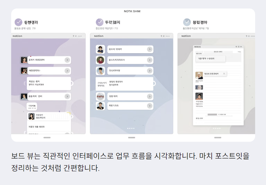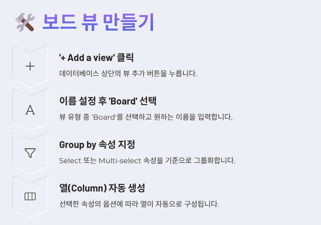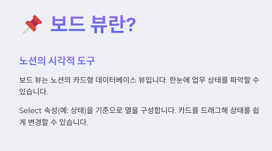보드 뷰는 노션에서 제공하는 카드형 데이터베이스 뷰 중 하나로, 항목을 속성에 따라 열(Column)로 구분하여 시각적으로 나열하는 방식이에요.