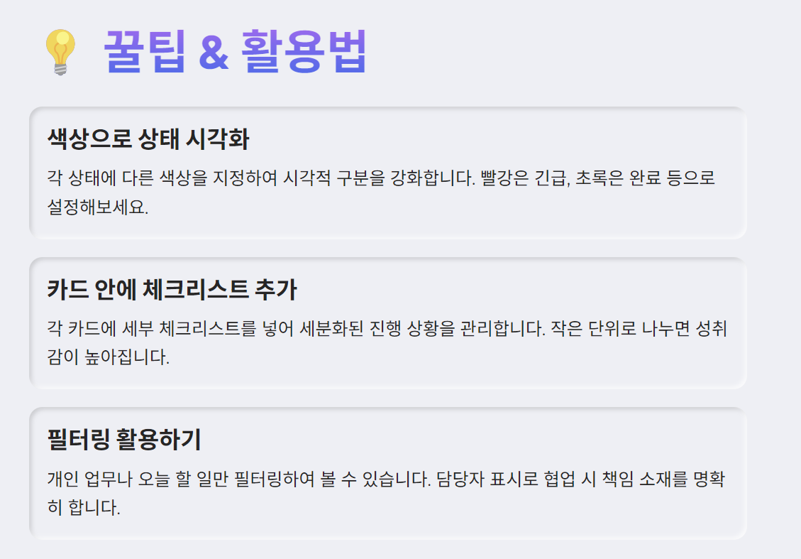 - 카드 드래그로 상태 변경 가능 → 흐름 파악 용이!