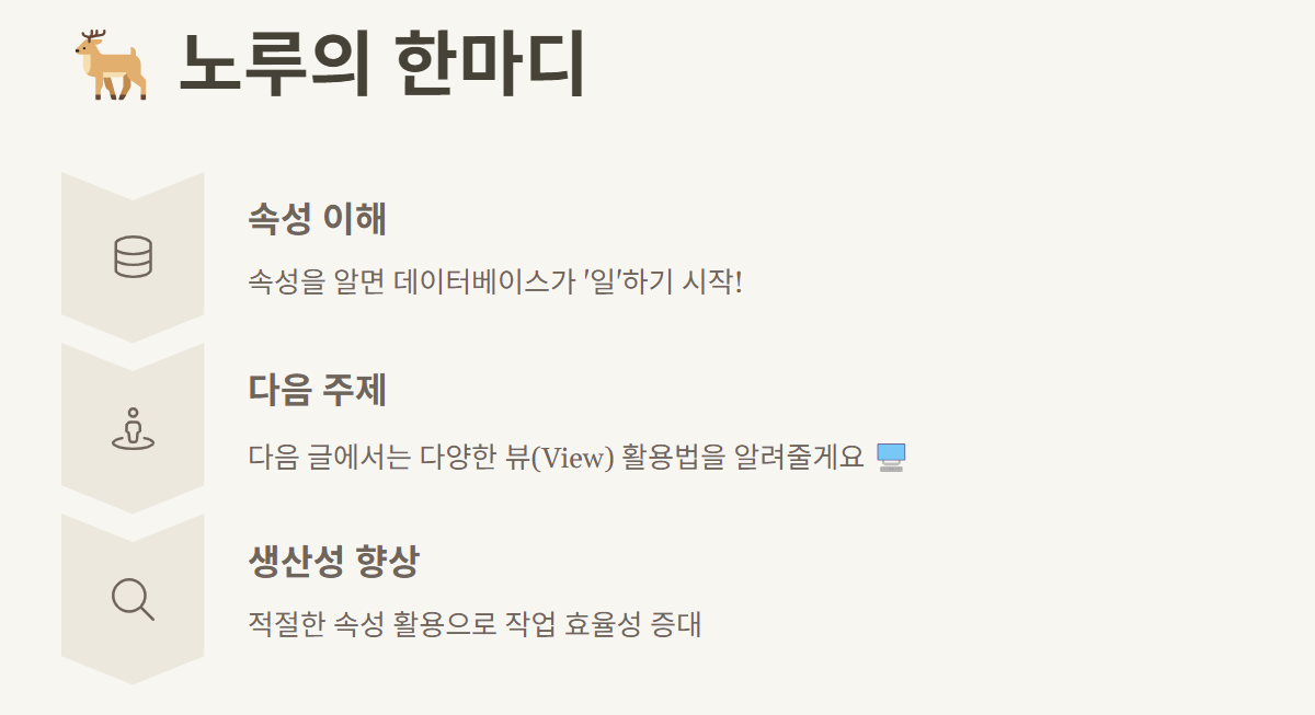 처음엔 속성이 어렵게 느껴질 수 있어요. 하지만 데이터의 성격을 생각하며 하나하나 맞는 속성을 넣다 보면, 어느 순간 “노션이 나를 위해 일한다!”는 걸 느끼게 될 거예요. 우리 다음 글에서는 다양한 데이터 뷰(View) 활용법을 소개해드릴게요! 🖥️