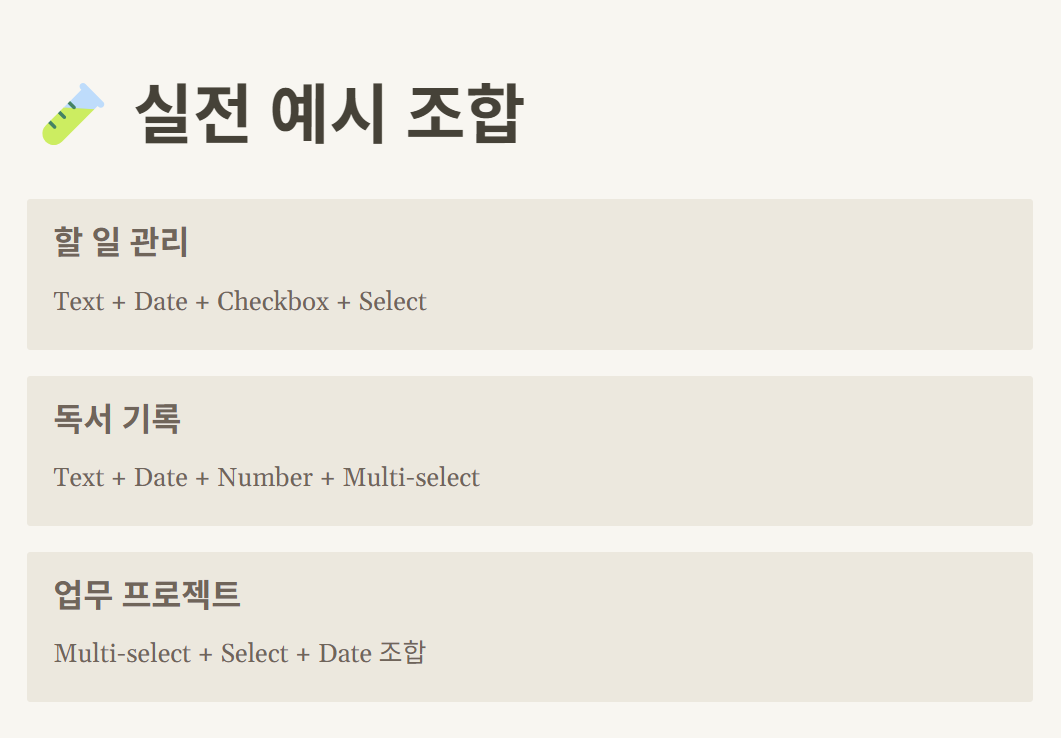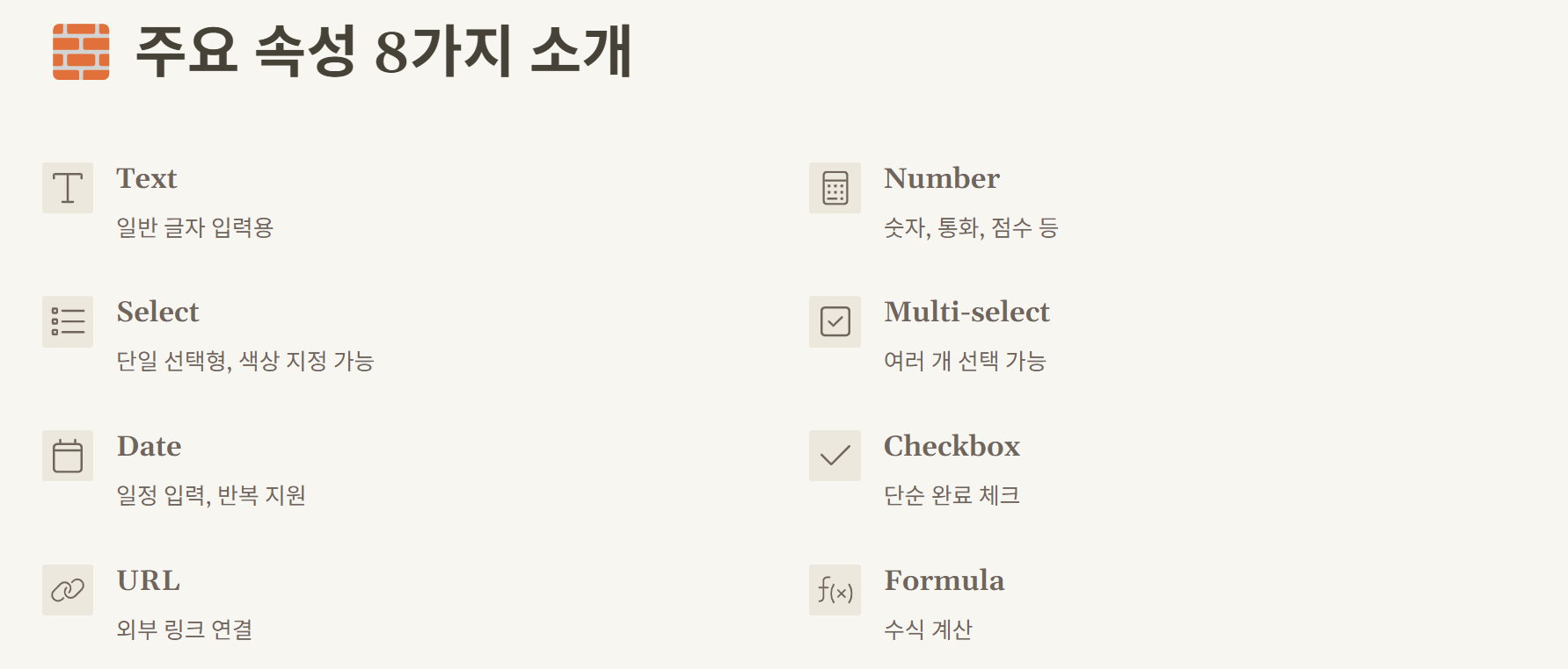 노션에서 데이터베이스를 잘 만들기 위한 핵심은 ‘속성(Property)’에 대한 이해입니다. 어떤 데이터를 입력할지에 따라 적절한 속성을 골라야 데이터베이스가 진짜 ‘일’하게 돼요.