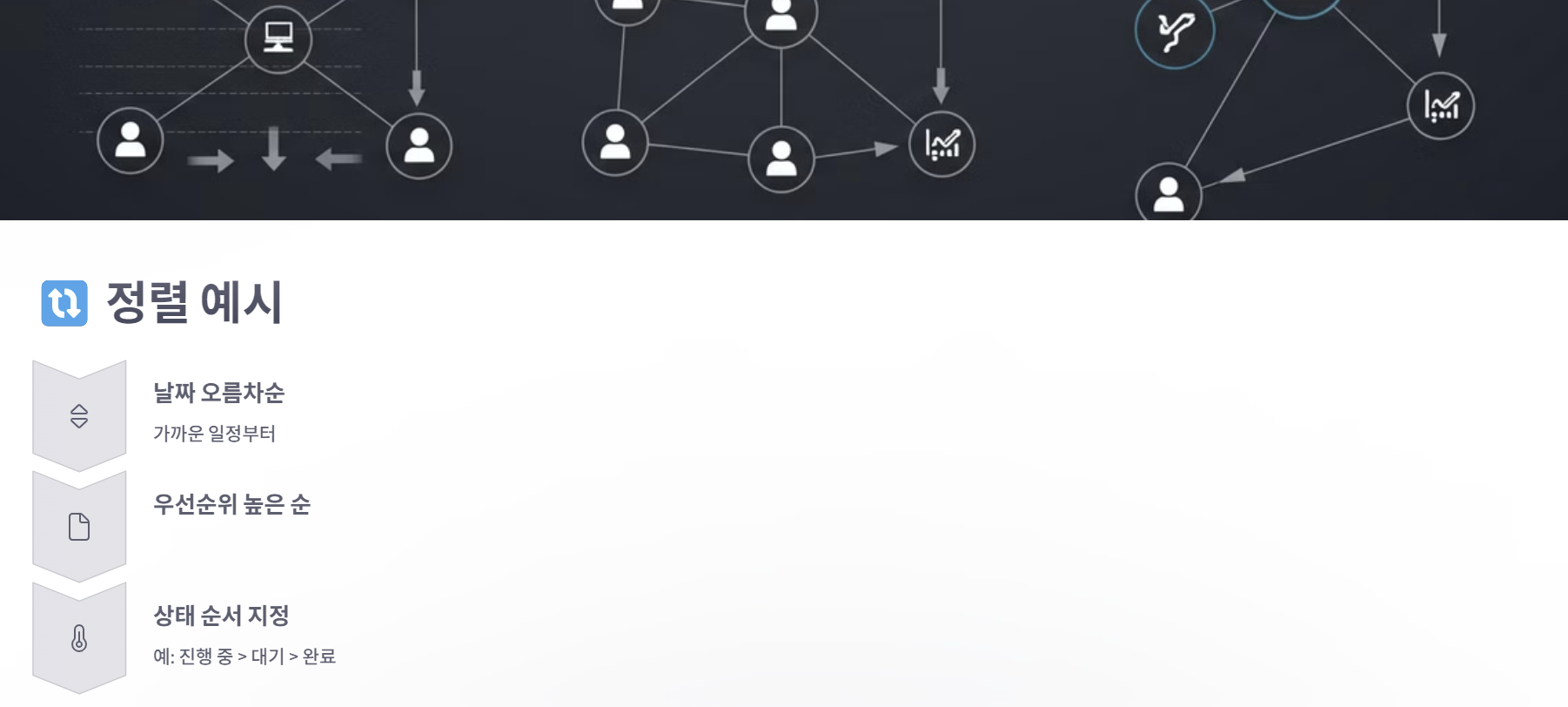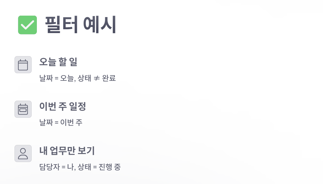 노션에서는 필터(Filter)와 정렬(Sort) 기능을 잘 활용하면 매번 새로운 보고서를 만들지 않아도 되고, 자동으로 오늘의 할 일 / 이번 주 보고 / 담당자별 정리가 가능해져요.