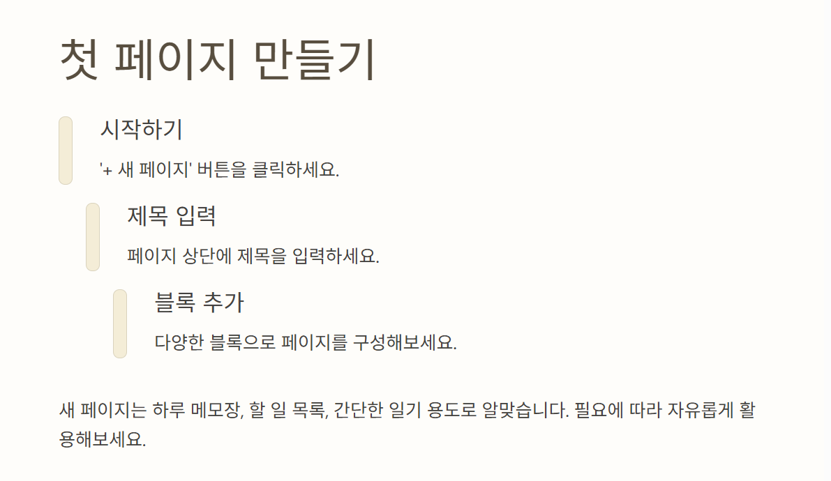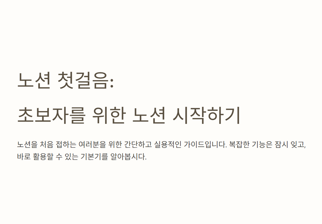 노션에서는 빈 페이지 하나가 바로 나만의 공간이에요. 우선 간단한 메모장 형식부터 만들어보며 시작해볼게요.