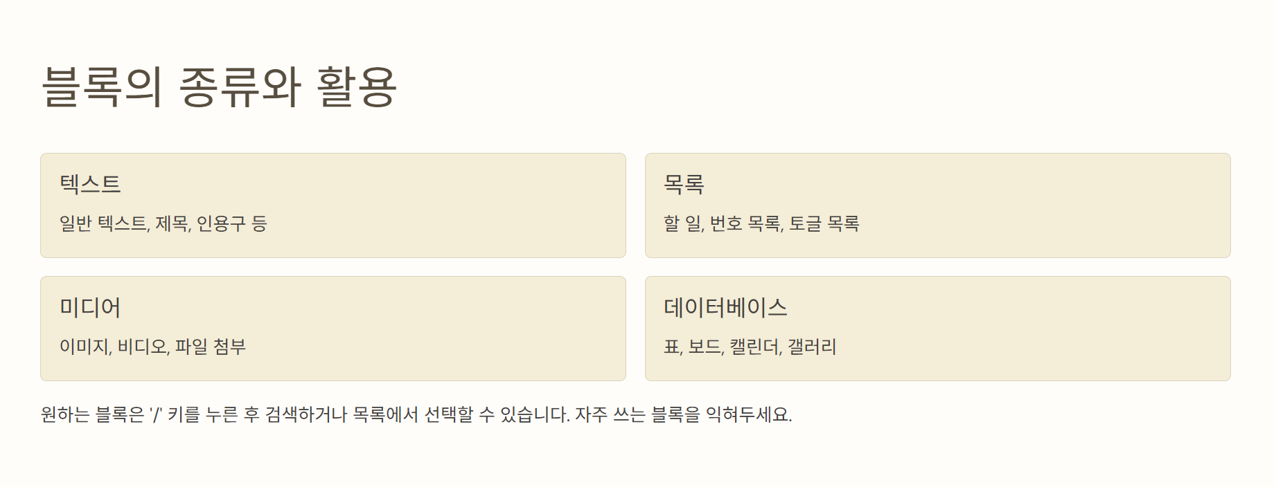 /입력 후h1,text,todo,divider등 다양한 블록 사용- 간단한 항목 구성 예시: