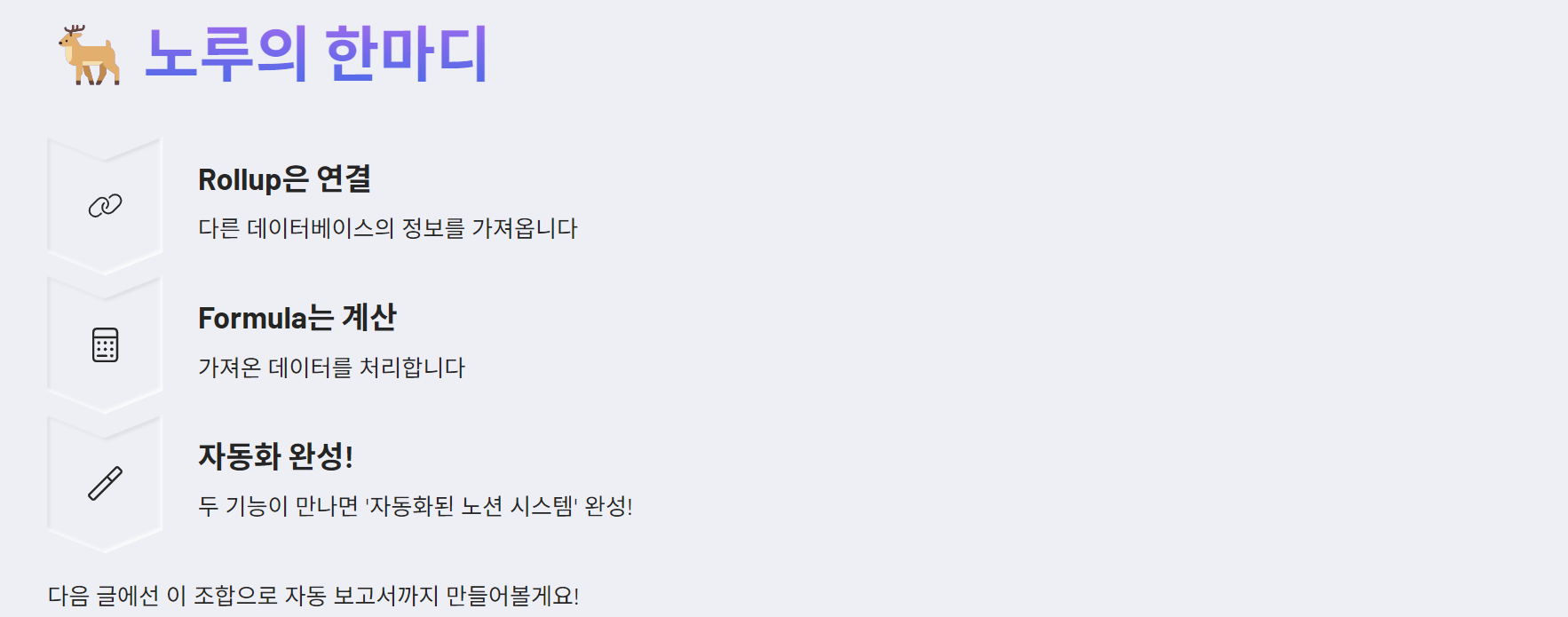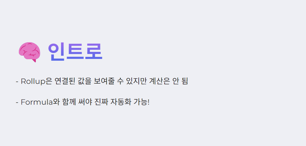 노션에서 Rollup은 정말 강력한 기능이지만, 불러온 데이터를 가공하거나 계산하려면 수식(Formula)과 함께 써야 해요.