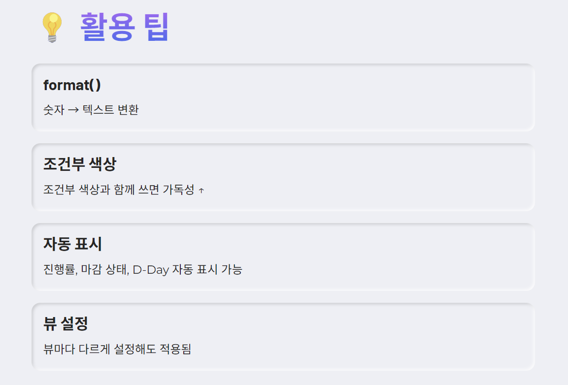 - ✅ 마감 임박 강조: 조건부 색상 서식과 함께 사용