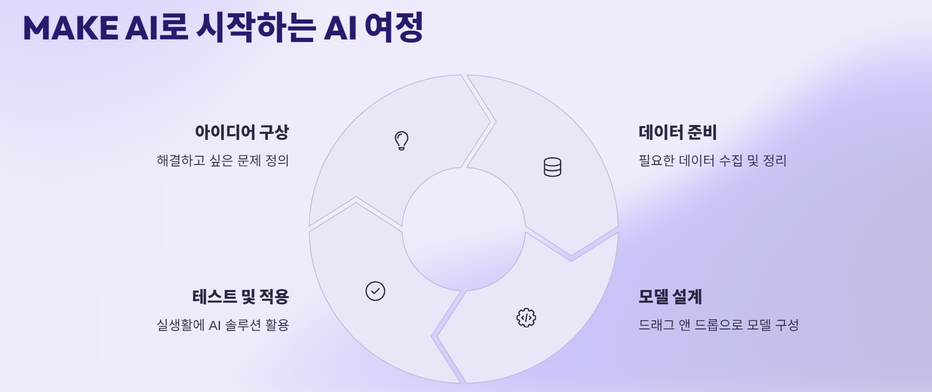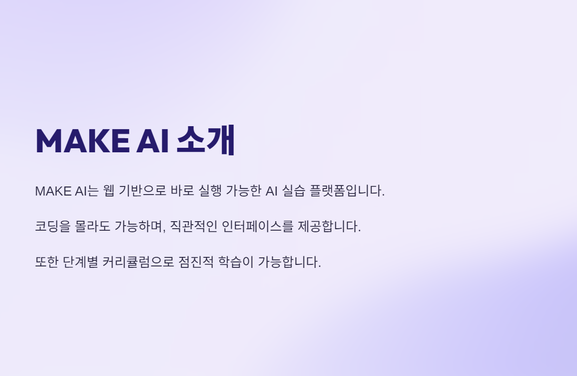 MAKE AI는 인공지능 학습을 쉽고 체계적으로 배울 수 있도록 도와주는 교육 및 실습 플랫폼이에요.