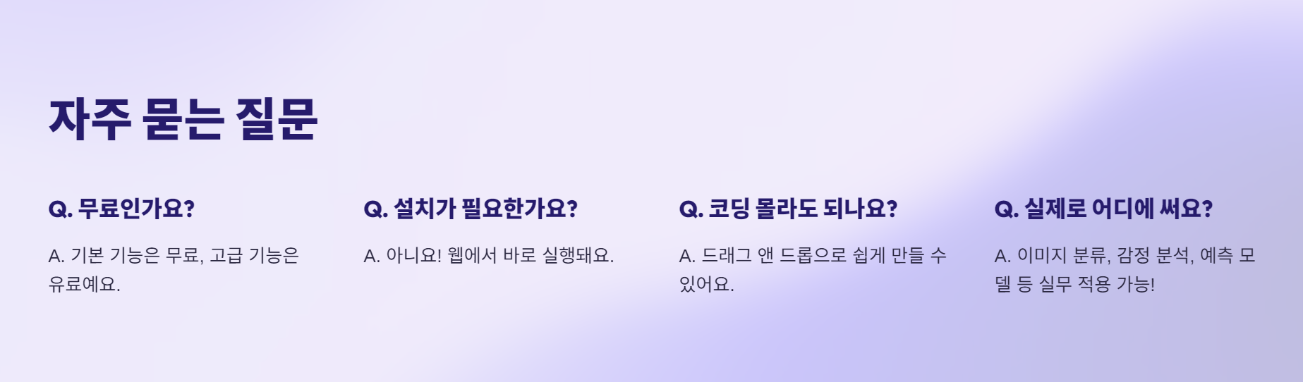 코드 한 줄 몰라도 AI 프로젝트를 시작할 수 있는 직관적인 인터페이스가 가장 큰 매력 포인트랍니다.